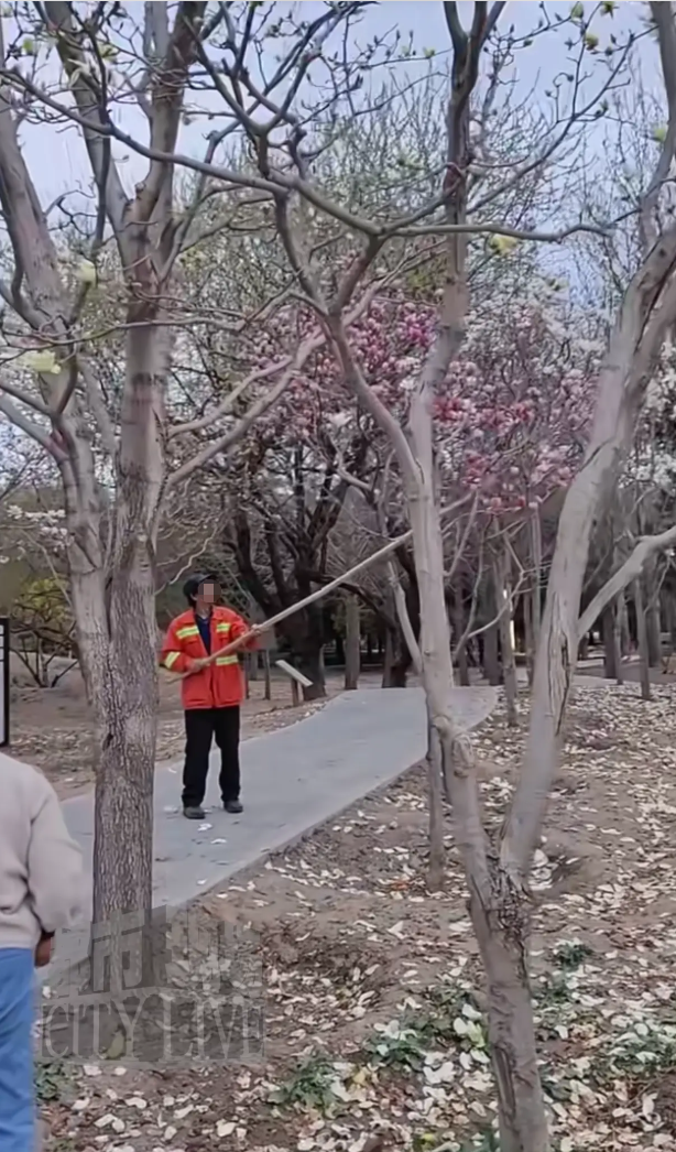3月29日,有网友发布视频称,在北京市兴隆郊野公园内,一位身着印有“景观兴隆”制服的工作人员手持竹竿,打落树上正盛开的花朵。
